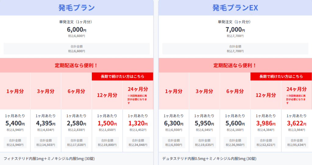 | 発毛プランEX | デュタステリド内服 30錠 ミノキシジル内服 30錠 | 6,930円/月 | 6,545円/月 合計19,635円 | 6,160円/月 合計36,960円 | 4,384円/月 合計52,621円 | 3,984円/月 合計95,634円 | 7,700円/月 |